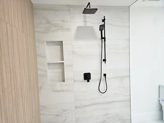 This was a very large and extensive work project including opening of subfloor, adding new floor joists to correct flaws, sophisticated plumbing rough-ins to allow for free standing air tub and combined shower wet area incorporating a curbless entry.