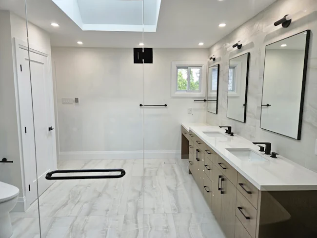 This was a very large and extensive work project including opening of subfloor, adding new floor joists to correct flaws, sophisticated plumbing rough-ins to allow for free standing air tub and combined shower wet area incorporating a curbless entry.
